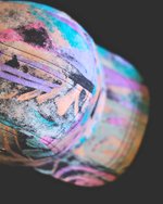 5-Panel-Cap aus frischem neonpastellfarbenem Stoff mit Pinselstrichen und körnigem Graffiti-Muster. Upcycling aus einem weichen Vintage-Baumwollbettlaken. Nur begrenzte Stückzahl verfügbar.