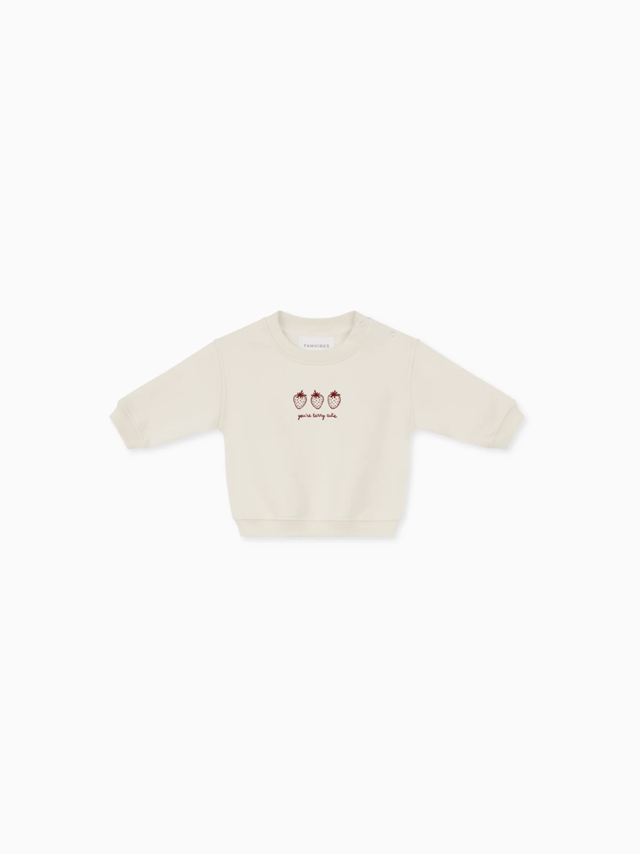 Das süße BERRY CUTE Baby Sweatshirt in zartem Milk-Ton verzaubert mit dem niedlichen Schriftzug ''You're Berry Cute'' und liebevoll gestickten Erdbeeren. Super weich, cozy und perfekt für Minis voller Freude und Sommerlaune, dazu gibt es die passenden süßen Strawberry Socken.