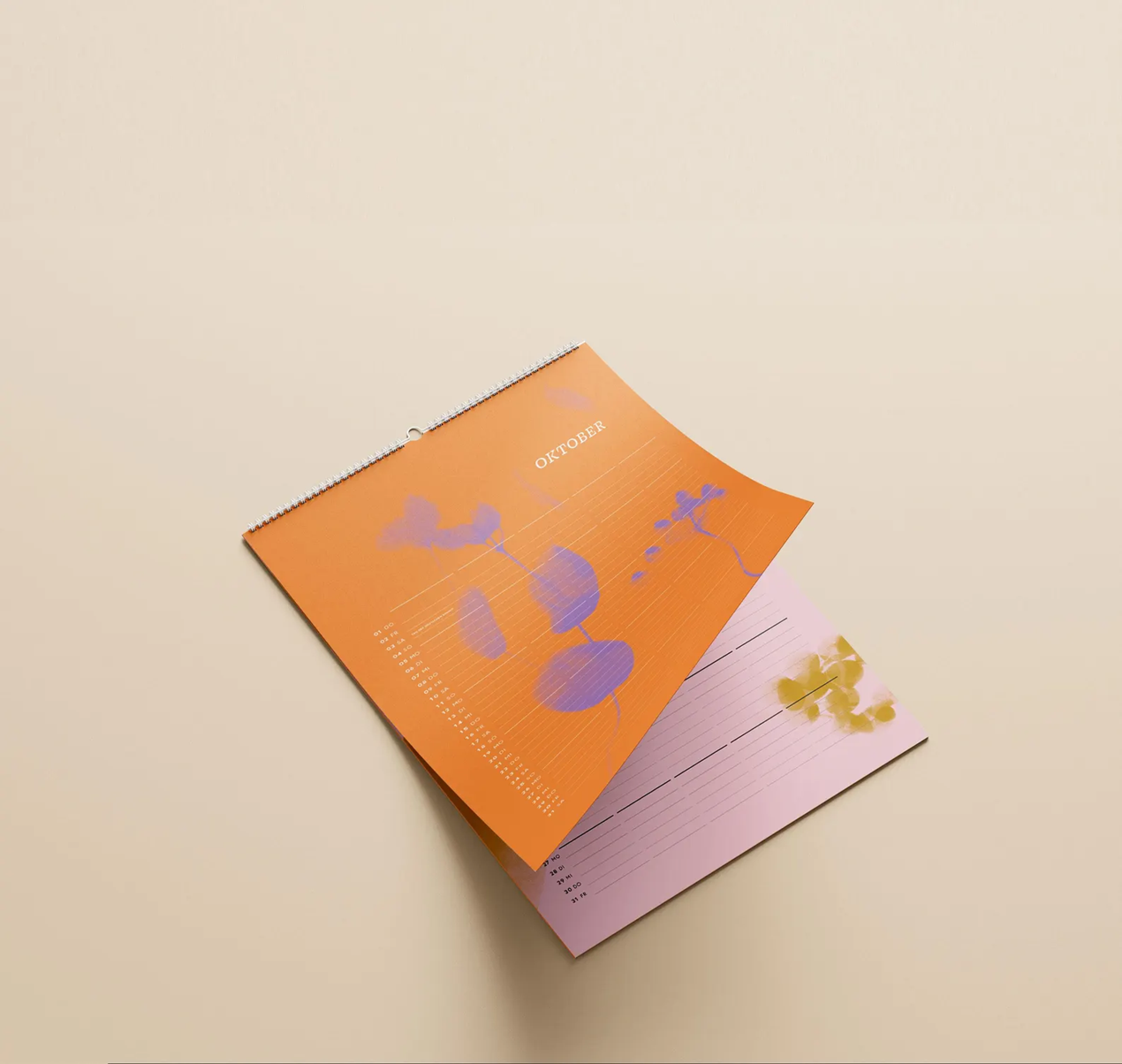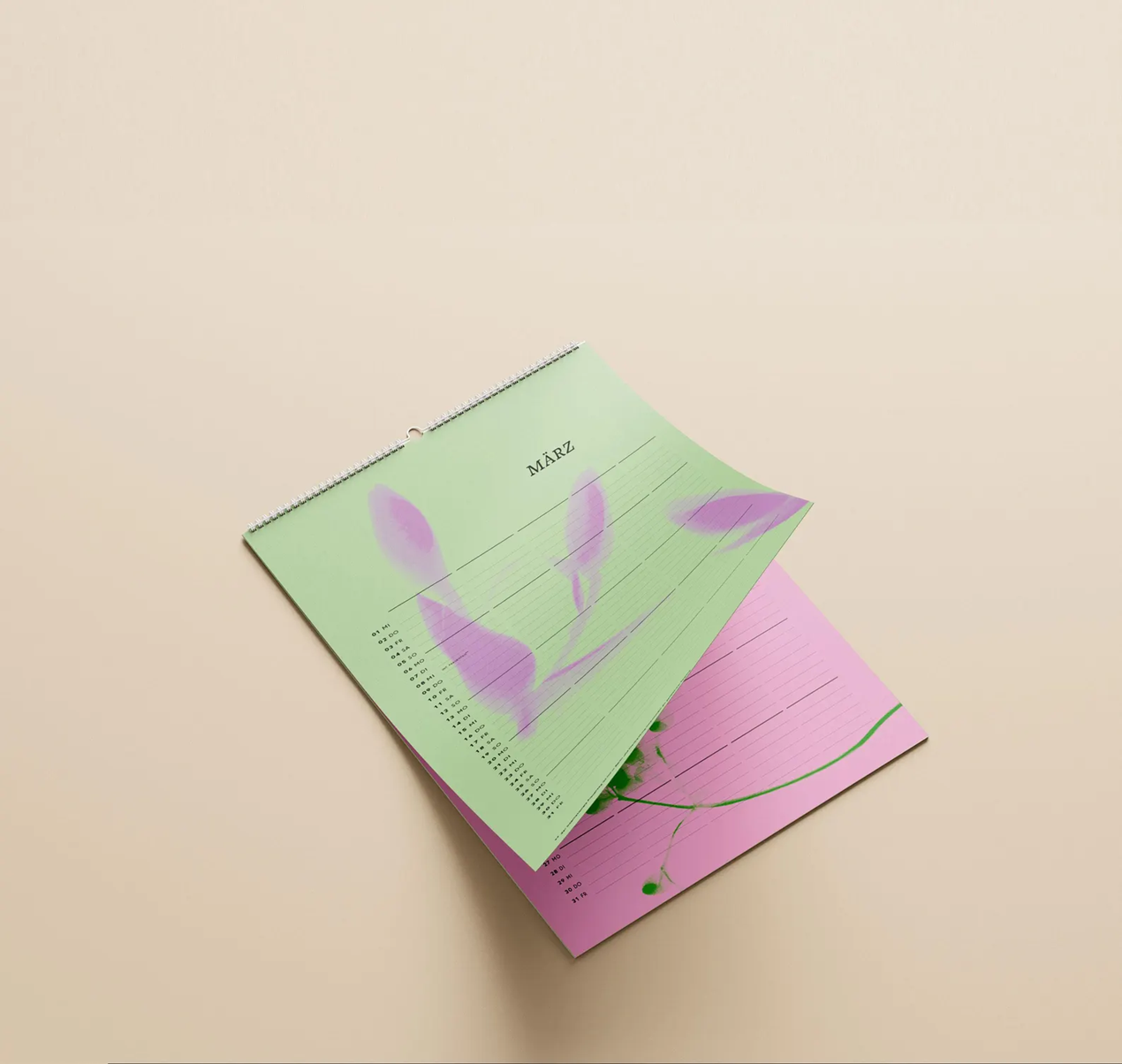 Seitenanzahl: 14 (1 Deckblatt, 12 Kalenderseiten und 1 Posterseite) mit Graupappe verstärkt.