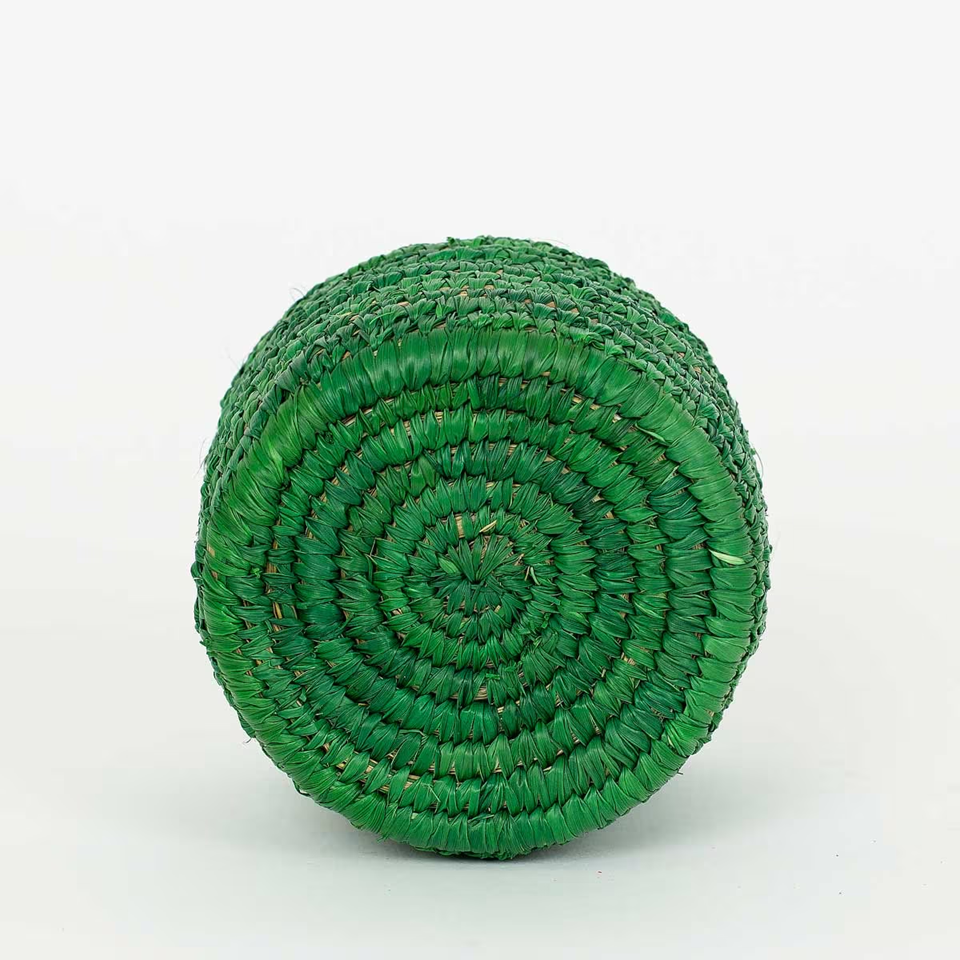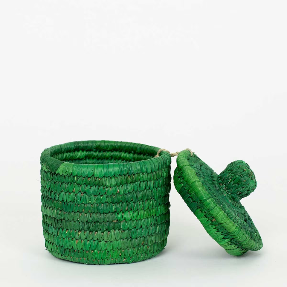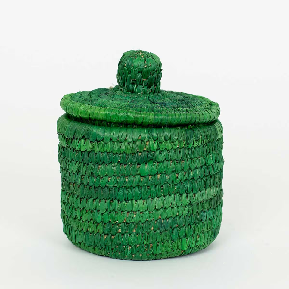 Ein kleiner, bunter Deckelkorb, der sich perfekt zum Aufbewahren von kleinen Gegenständen wie Ringen oder kleinen Münzen eignet. Der Korb ist handgeflochten aus gefärbten Palmblättern.