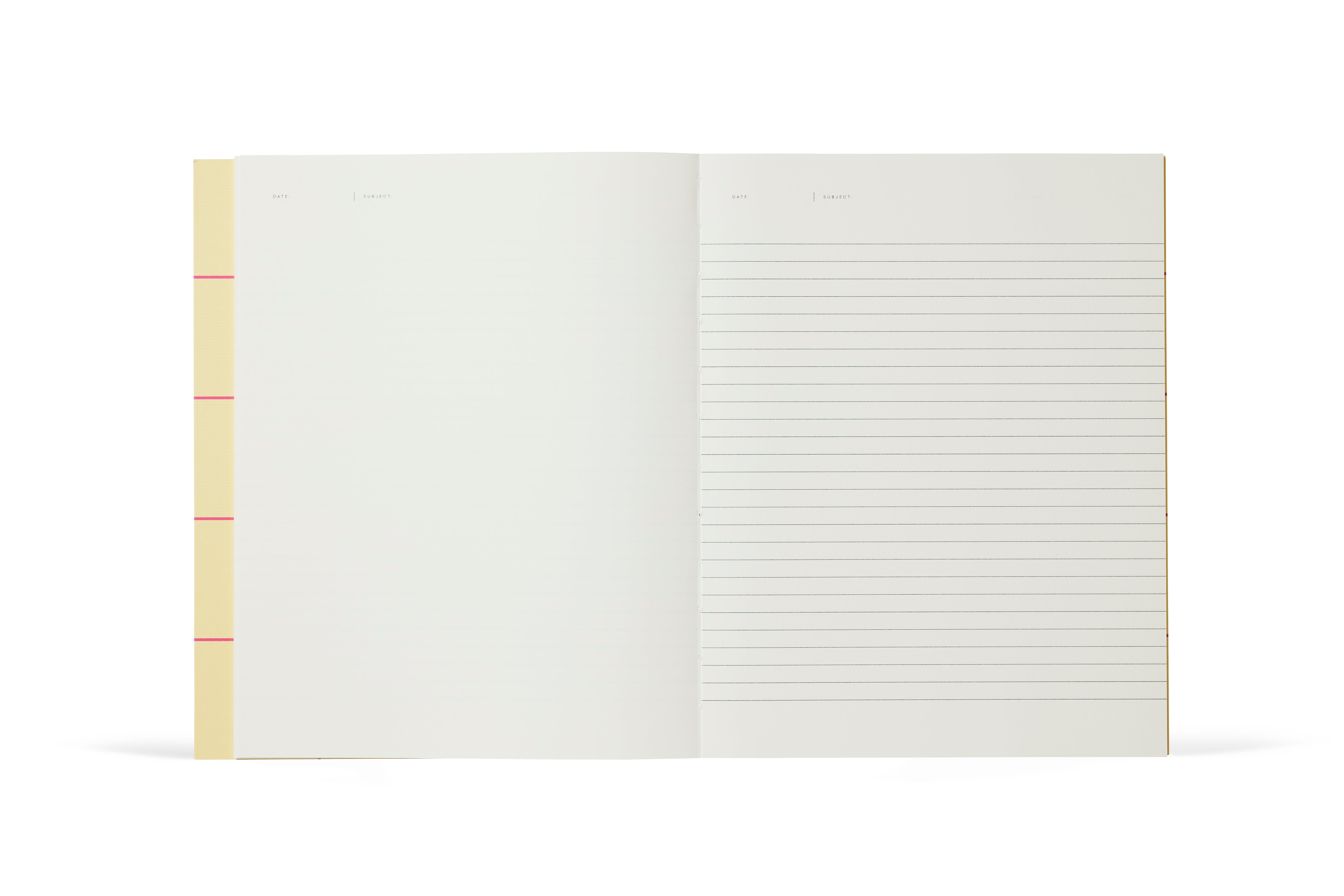 Das offene Notizbuch zeigt eine leere linke Seite und eine linierte rechte Seite, die Platz für Skizzen, Mindmaps, Notizen und Kritzeleien lässt.