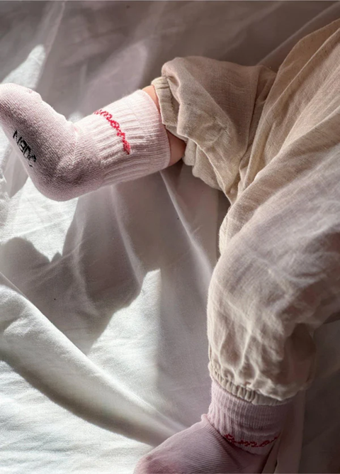 Liebe auf den ersten Schritt. Die amore Socken für Babys bringen große Gefühle auf kleine Zehen. Zartes Rosa trifft auf ein rotes, gesticktes amore – weich, cozy und einfach zum Verlieben.