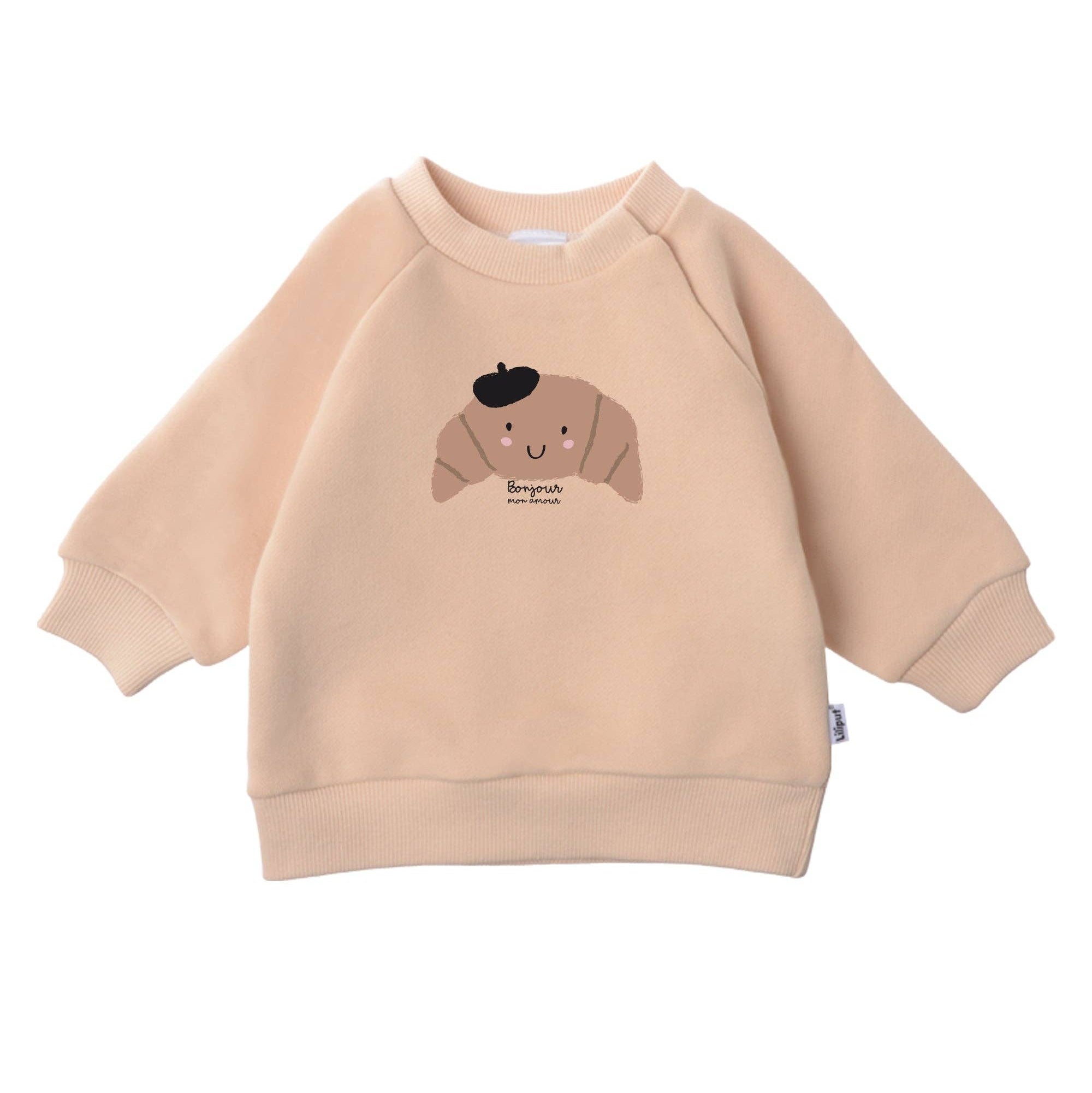 Das weiche Sweatshirt in beige mit Print "Croissant" ist perfekt für kleine Snack Liebhaber geeignet. An den Ärmeln befinden sich elastische Ribbündchen. Dank der Baumwollmischung ist der Pullover angenehm weich auf der Haut.