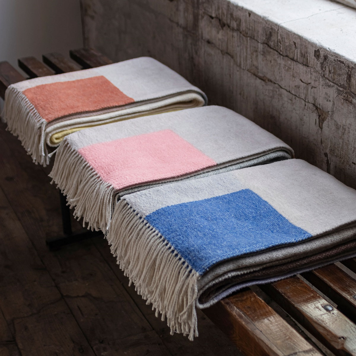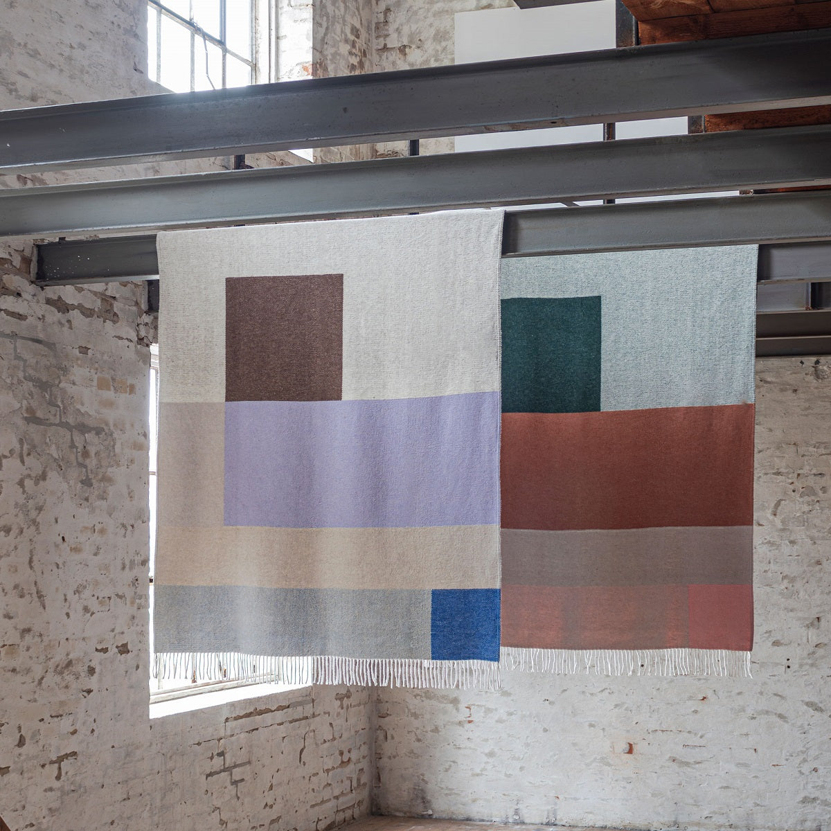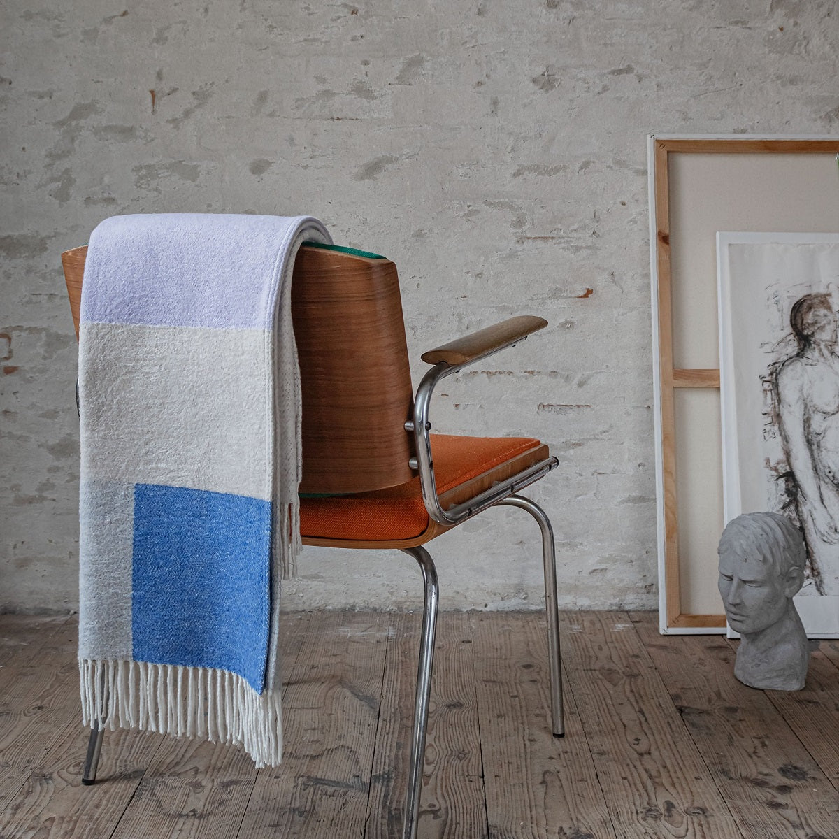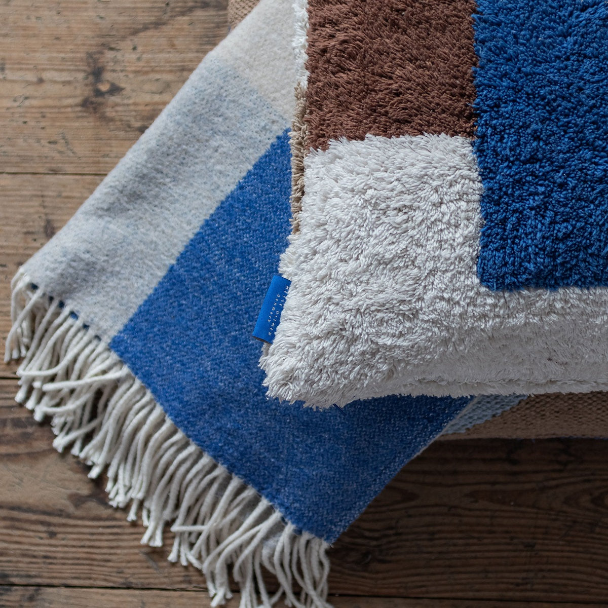 Hüllen Sie sich in wunderschöne Farben und bleiben Sie warm mit der BRICK Decke. Die Decke hat einen sandfarbenen Grundton, Blockfarben in Braun und Lila sowie ein dunkelblaues Kontrastdetail in der Ecke, das einen harmonischen und verspielten Look erzeugt. Fransen an beiden Enden verleihen dem Design zusätzliche Struktur und runden es elegant ab.