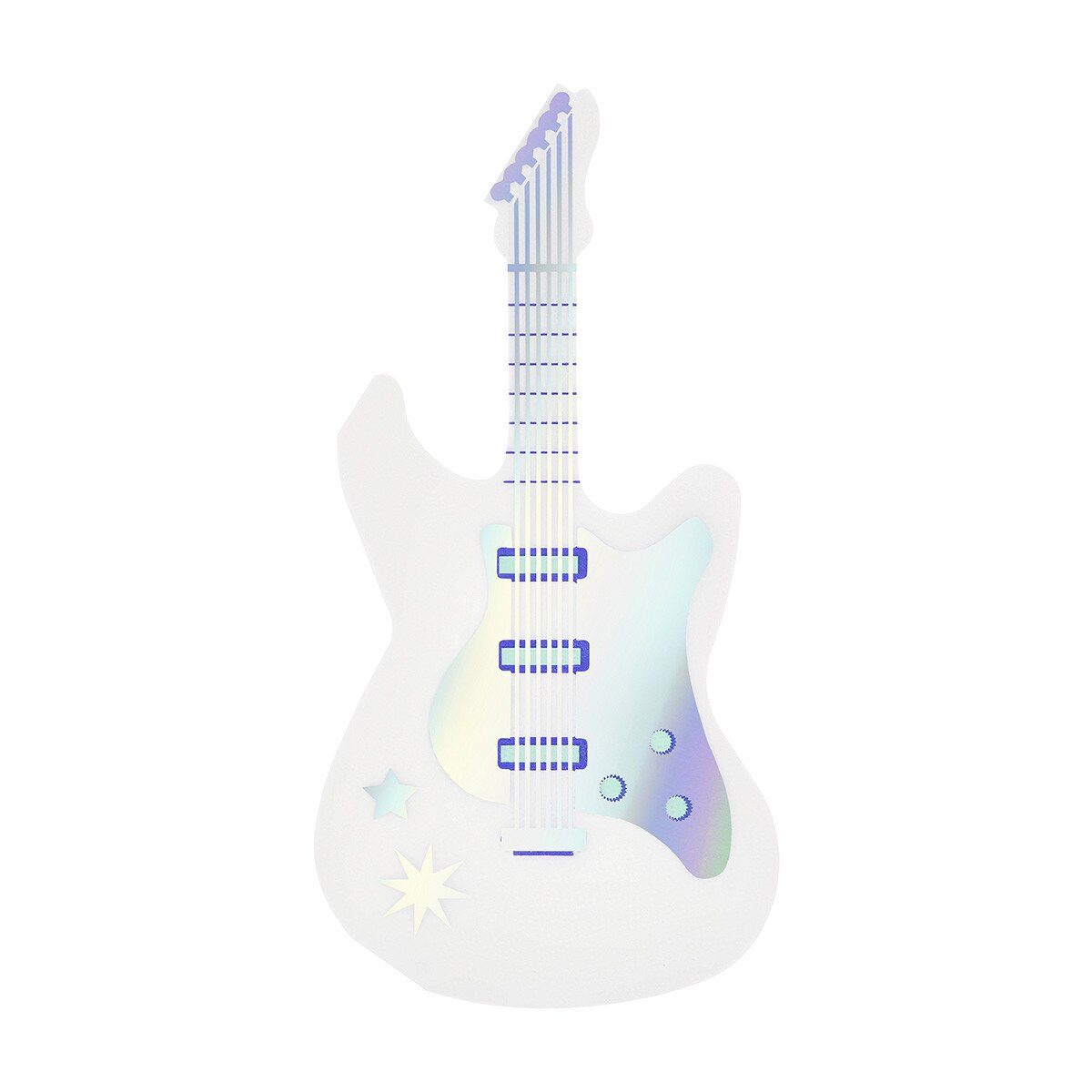 Lautstärke voll aufdrehen, Partyzeit! Diese Papierservietten mit E-Gitarren-Motiv bringen mit ihren glänzenden, silbernen Hologramm-Foliendetails sofort Rockstar-Feeling auf deine Party. Perfekt für Kinder, Jugendliche und Erwachsene, die gerne abrocken. Verziere deine Tischdeko oder serviere sie zu Speisen, Snacks oder Leckereien – für einen coolen Hingucker.