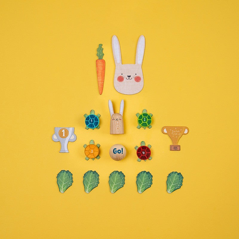 Ein sehr lustiges Kooperationsspiel, inspiriert von der Fabel vom Hasen und der Schildkröte, ab 5 Jahren. Nachhaltiges Spiel aus Karton und Holz. Hergestellt in Barcelona.