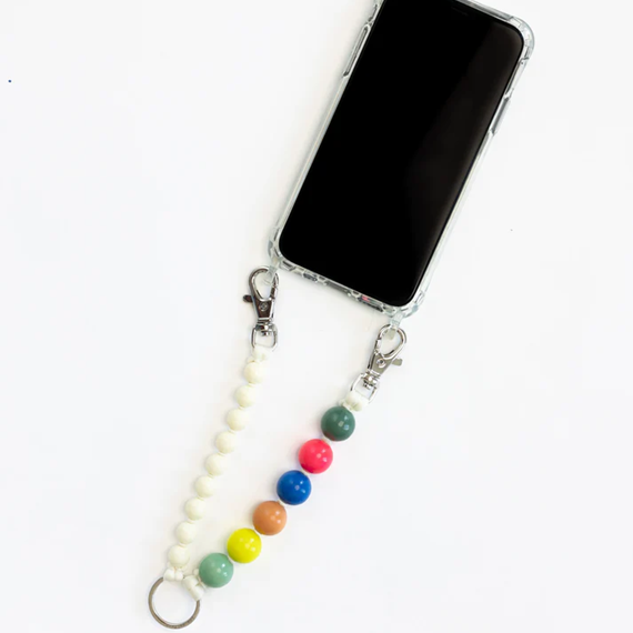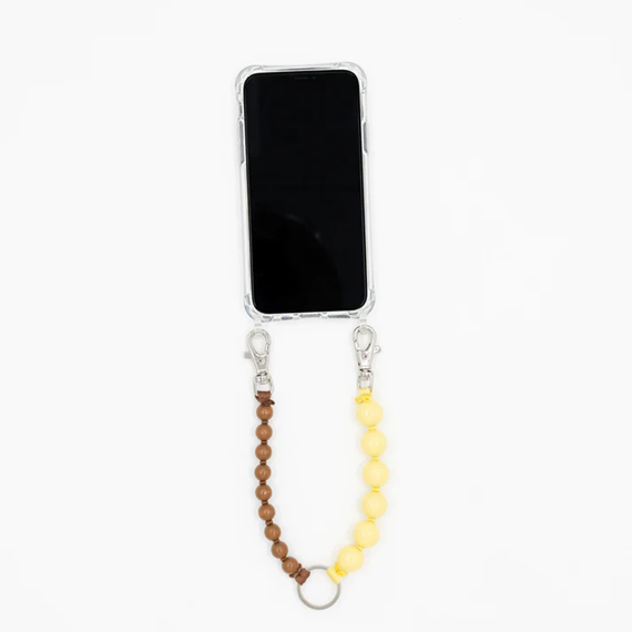 Handykette mit Gummiband und aufgefädelten Holzperlen.