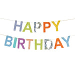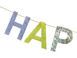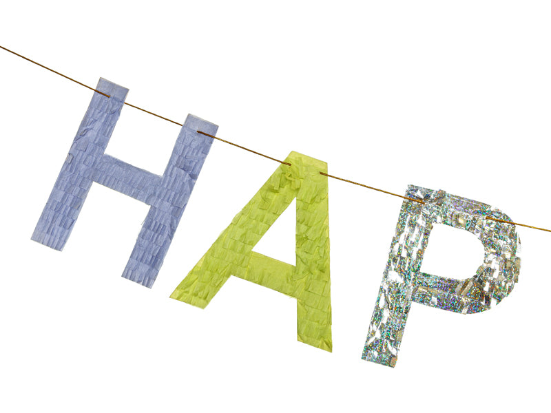 Happy Birthday-Banner aus bunter Folie und Seidenpapier mit Quasten.