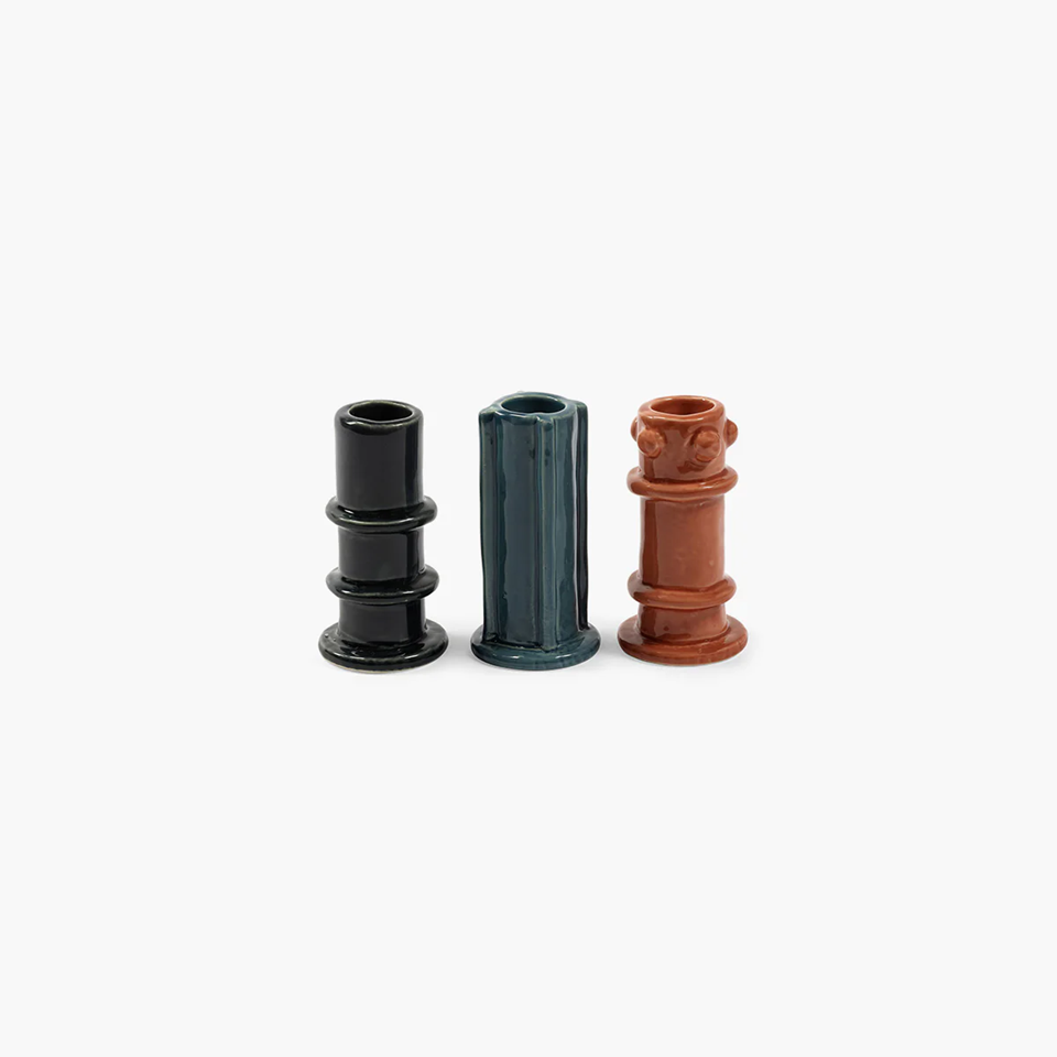 Ein verspieltes Set aus Kerzenhaltern aus Keramik, entworfen von Marie Michielssen für die Molly-Kollektion. Jeder Kerzenhalter hat eine eigene Form und eine farbenfrohe Glasur. Zusammen ergeben sie ein lebendiges Trio, das jedem Interieur Charakter und Kreativität verleiht.