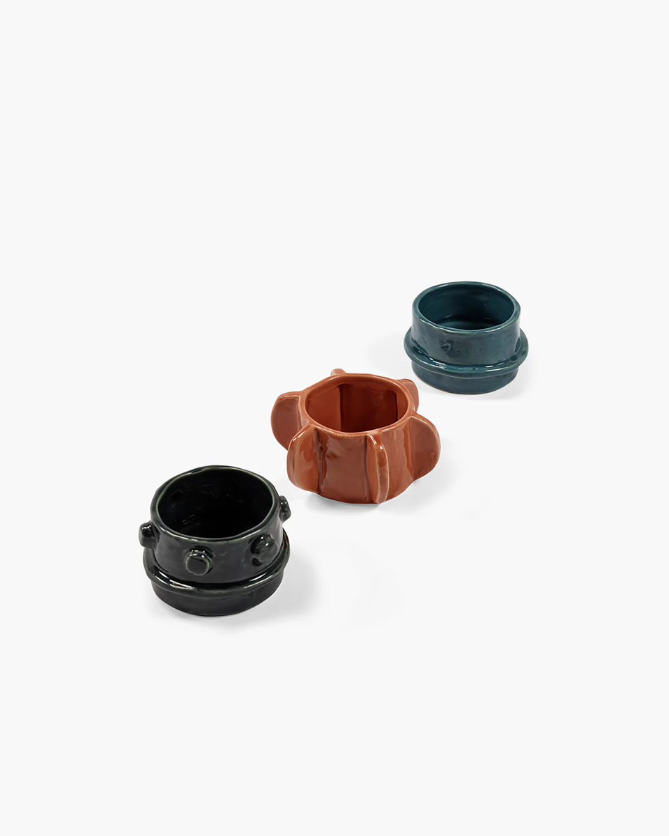 Ein verspieltes Trio aus Keramik-Teelichthaltern der Molly-Kollektion von Marie Michielssen. Jedes Stück hat seinen eigenen Charakter, mit verspielten Details und einer tiefen Glasur in warmen, erdigen Farbtönen. Ideal, um jedem Raum eine kreative, stimmungsvolle Note zu verleihen.
