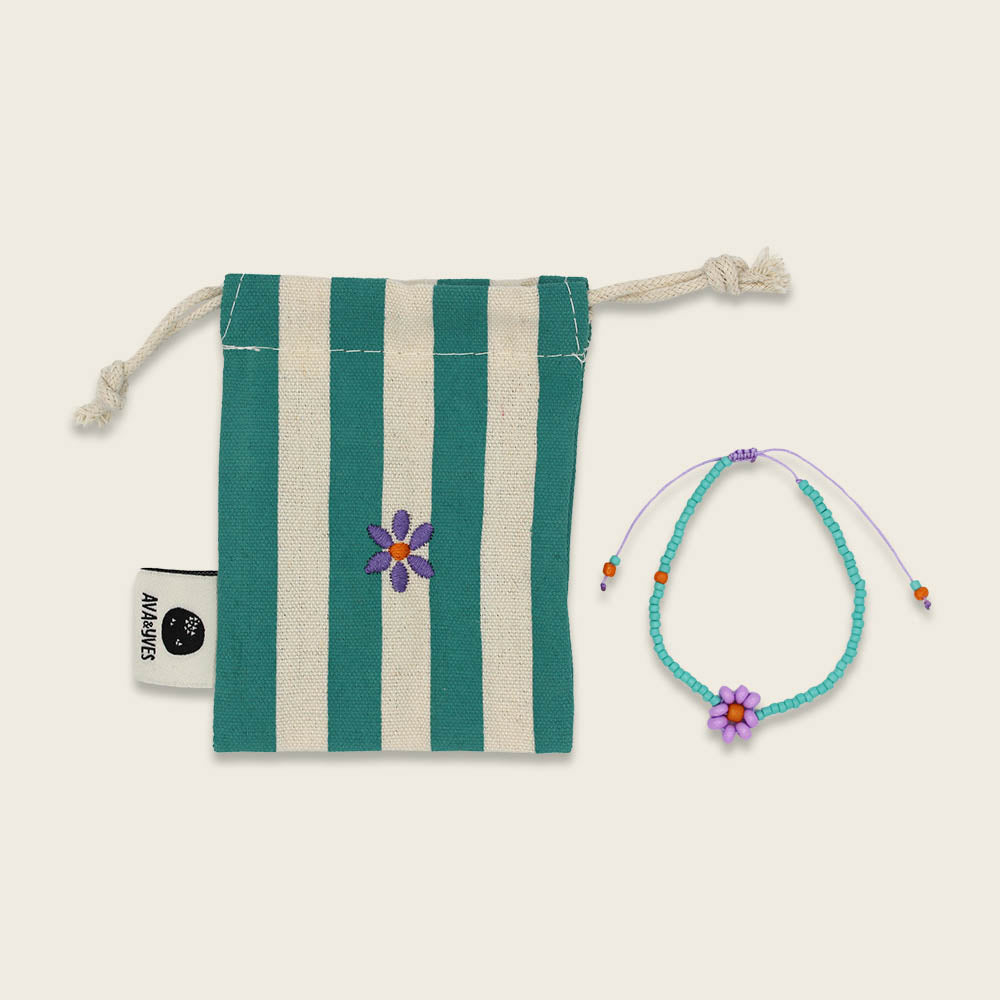 Perlenarmband petrol mit Blume, mit Makrameeverschluß und Säckchen petrol/weiss mit Blumenstickerei