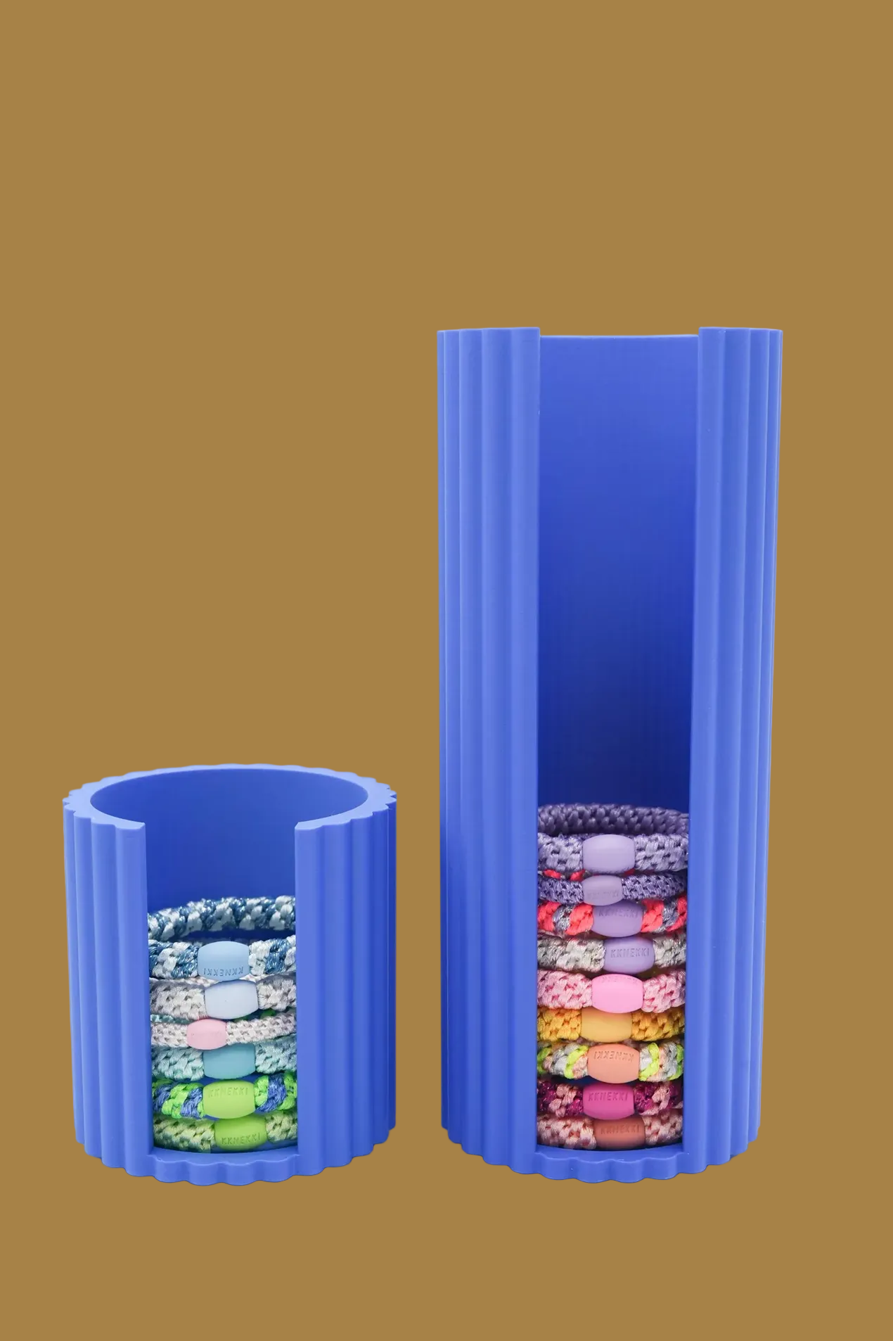 Mit einer Höhe von 8 cm bietet die kleine Box ausreichend Platz für rund 10 Haargummis und mit einer Höhe von 19 cm bietet die große Box ausreichend Platz für rund 24 Haargummis.