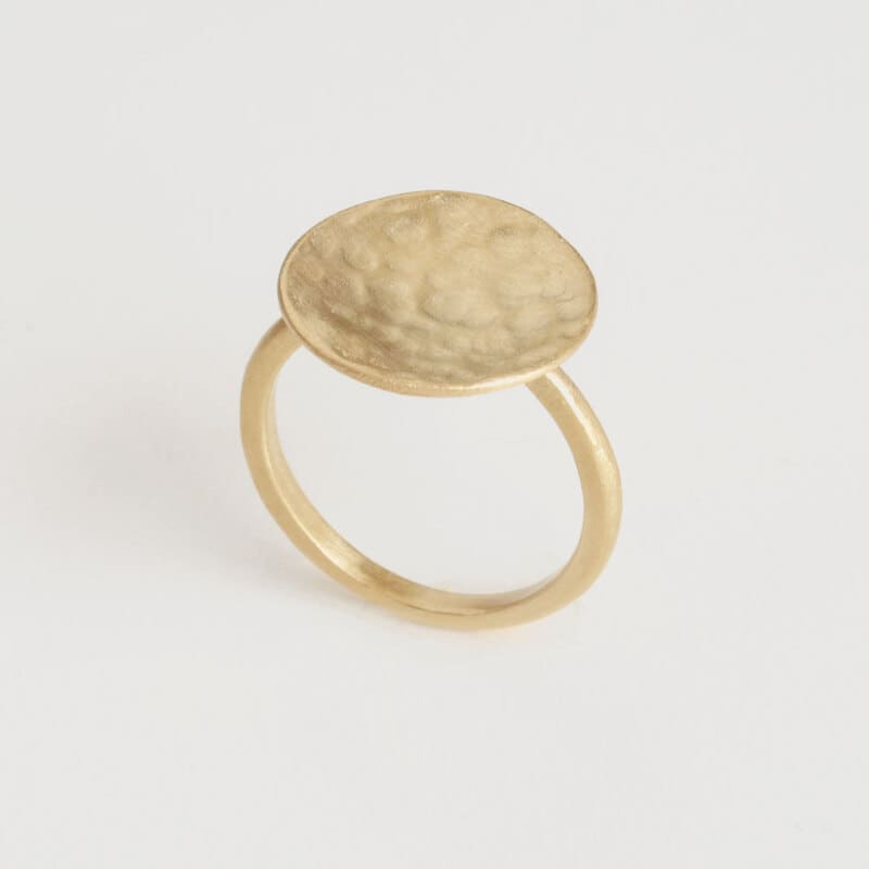 Dieser bequeme goldene Kreisring erinnert mit seiner gehämmerten Textur an den Vollmond. Ein zeitloser Ring, perfekt, um Ihrem Alltagslook den letzten Schliff zu verleihen. Lassen Sie sich vom Mond beeinflussen, indem Sie den Mondring tragen!
