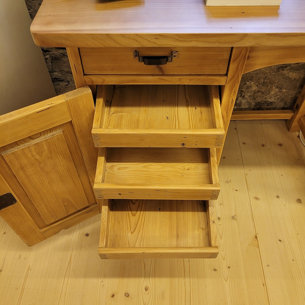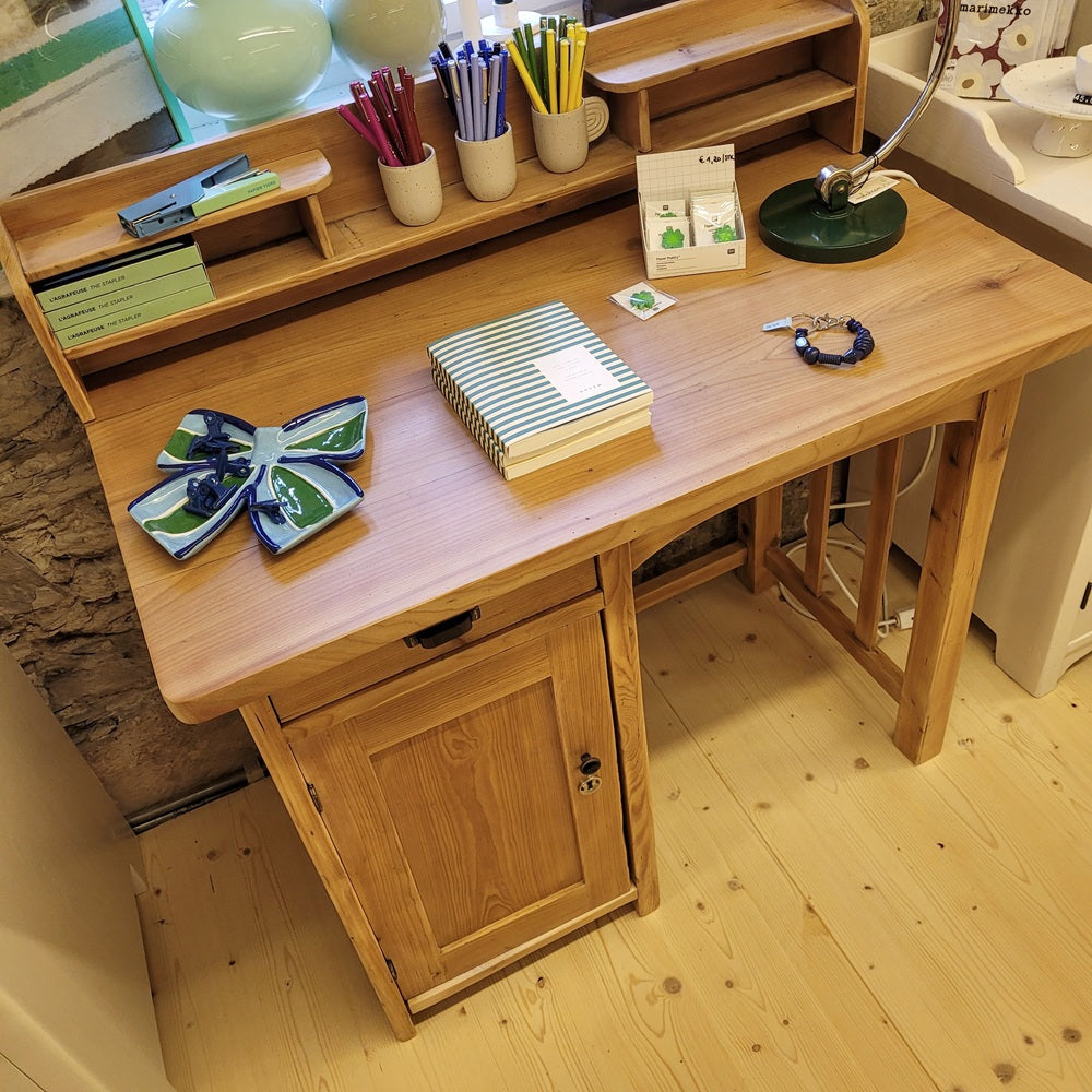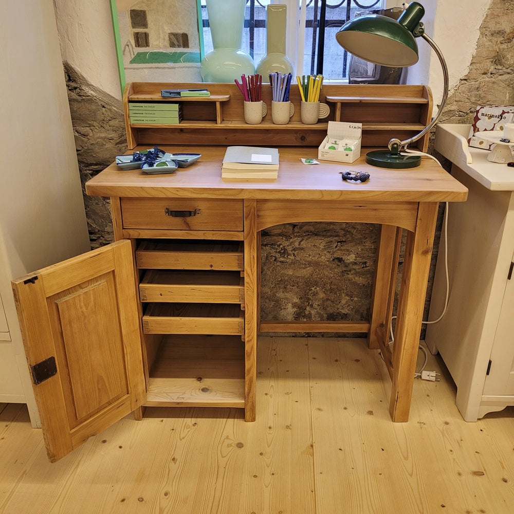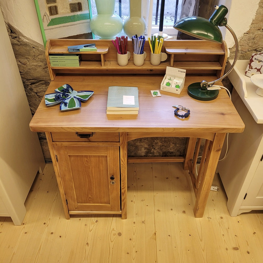 Maße: 98 cm b/54 cm t/ 80 cm h Tischplatte/100 cm h insgesamt/69,5 cm h vom Boden bis zu Unterkante Schreibtisch (Beinfreiheit)