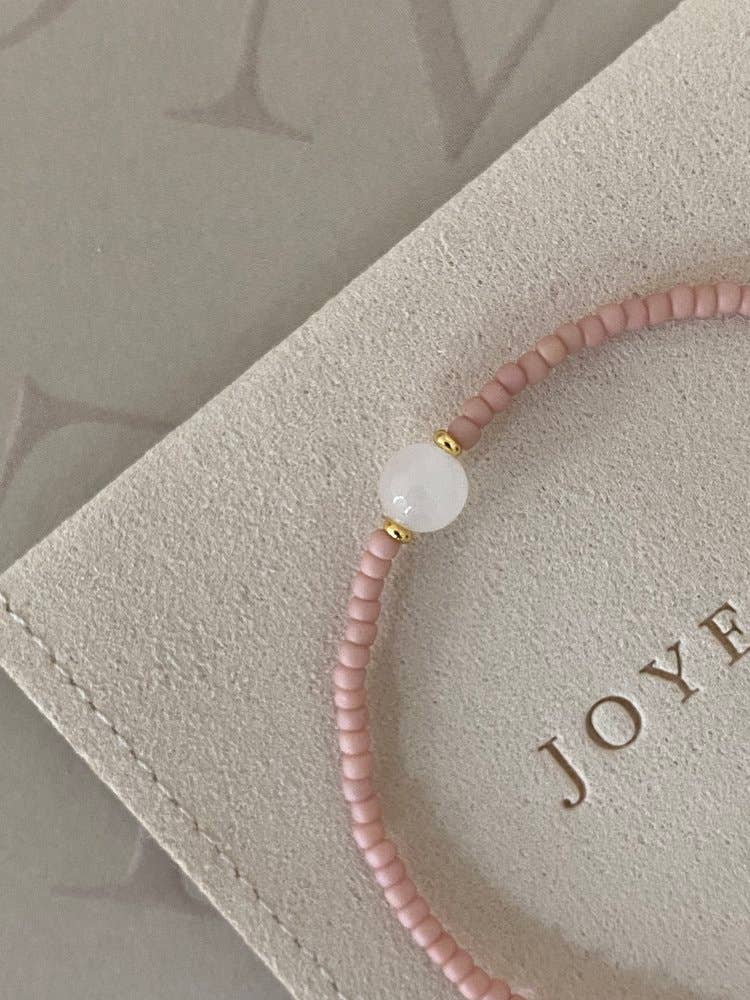 - Materialien: echter Rosenquarz-Edelstein, wasserdichte japanische Premium-Glasperlen in staubigem Roséglas und