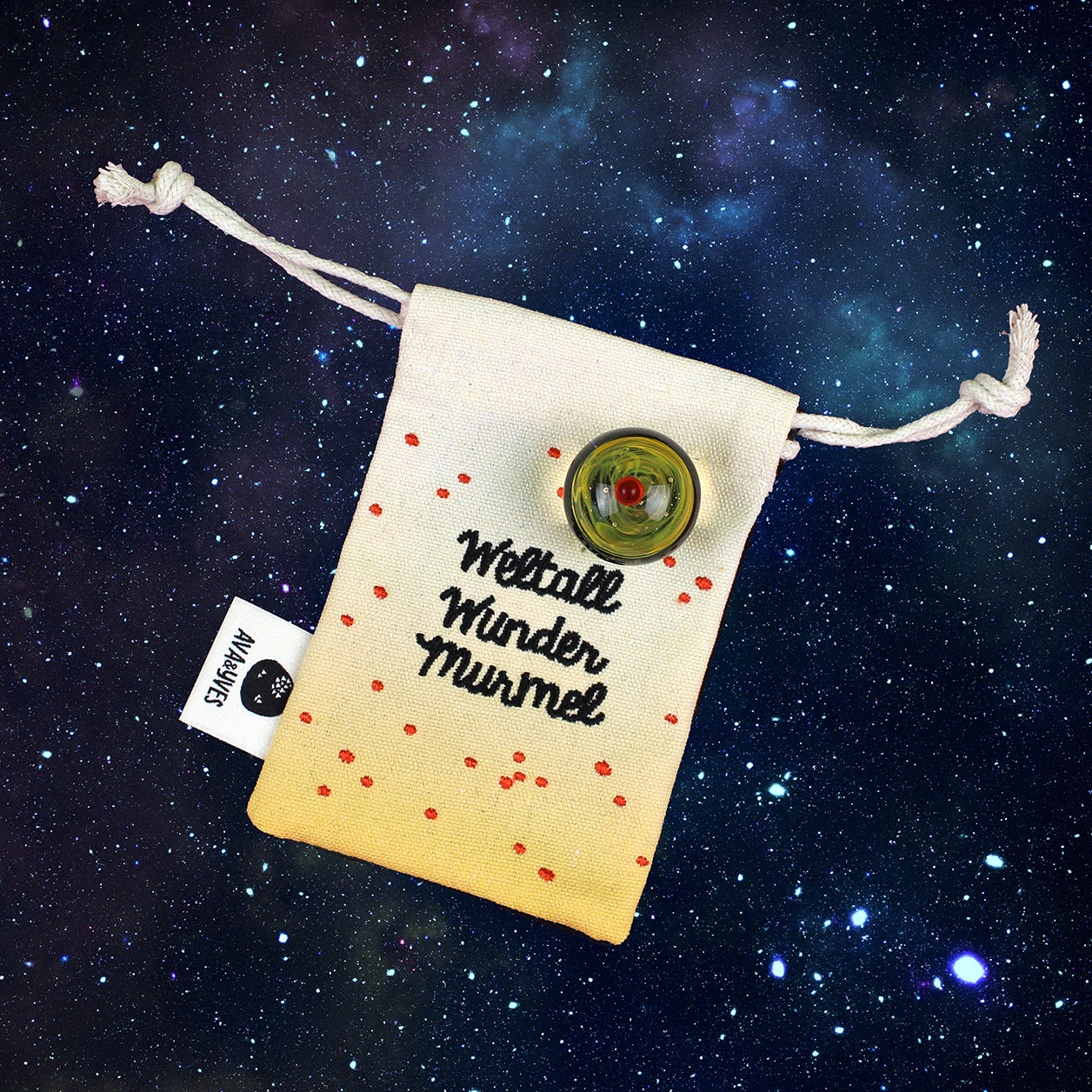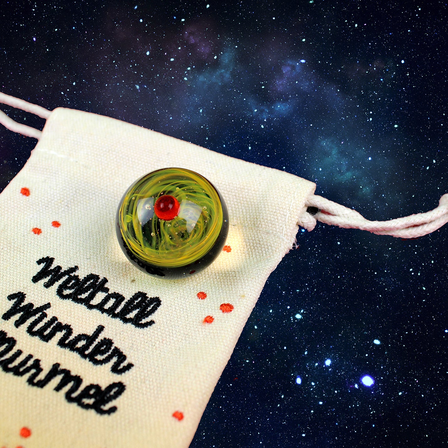 Weltall-Wundermurmel handgefertigt, grün mit Milchstrasse und Planet, 25mm, in hochwertigem Stoffbeutel mit Stickerei